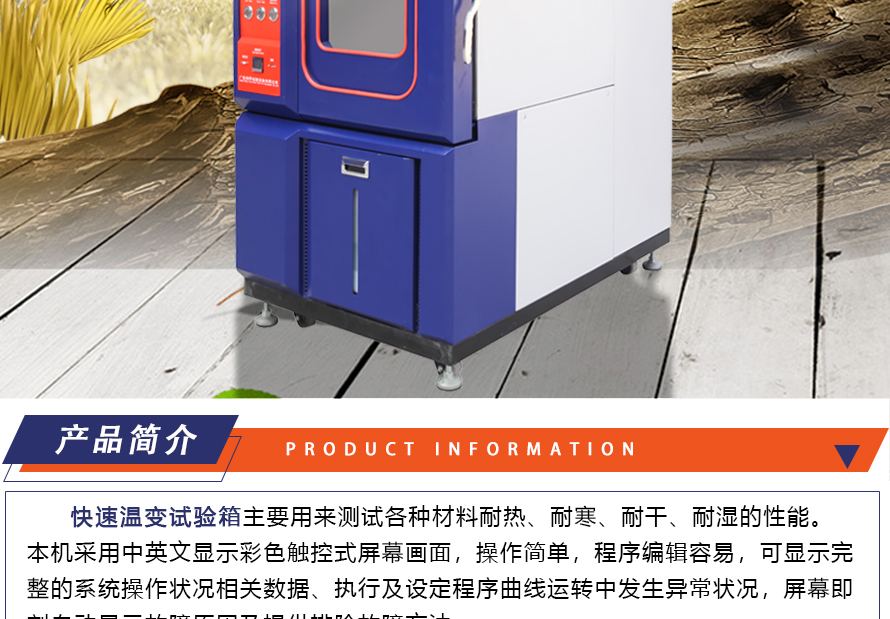 產品型號:JQESS-100 品牌:劍 喬 用途:快速溫變試驗箱主要用來測試各種材料耐熱、耐寒、耐干、耐濕的性能。本機采用中英文顯示彩色觸控式屏幕畫面,操作簡單,程序編輯容易,可顯示完整的系統操作狀況相關數據、執咨詢熱線:13829135130