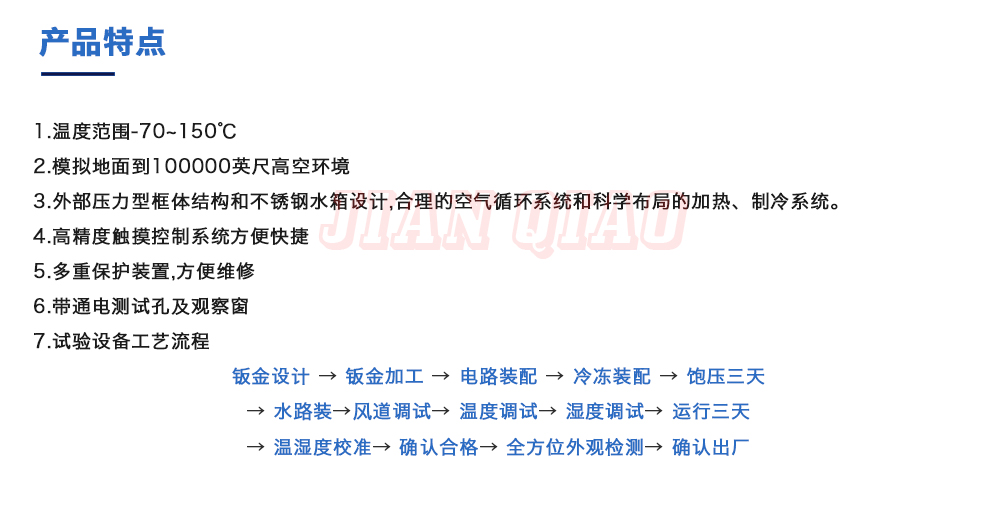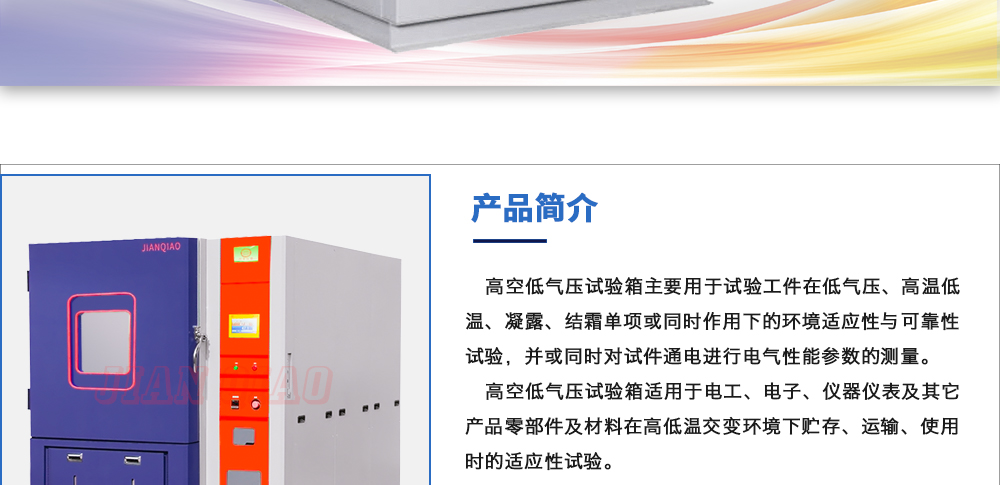 產(chǎn)品型號:JQTA-504 品牌:劍 喬 用途:高低溫低氣壓試驗箱主要用于試驗工件在低氣壓、高溫低溫單項或同時作用下的環(huán)境適應(yīng)性與可靠性試驗,并或同時對試件通電進(jìn)行電氣性能參數(shù)的測量。咨詢熱線:13829135130