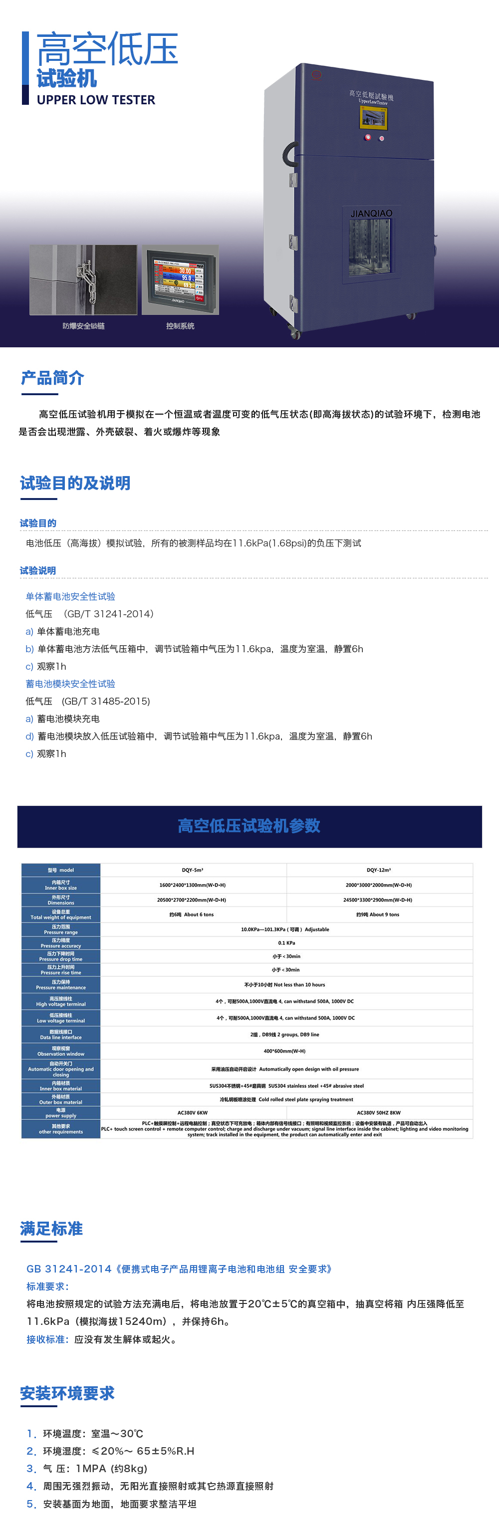 產品型號:JQ-8104(可定制) 品牌:劍 喬 用途:高空低壓試驗機用于模擬在一個恒溫或者溫度可變的低氣壓狀態(tài)(即高海拔狀態(tài))的試驗環(huán)境下,檢測電池是否會出現(xiàn)泄露、外殼破裂、著火或爆炸等現(xiàn)象。咨詢熱線:13829135130