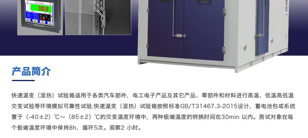 產(chǎn)品型號(hào):JQ-12㎡(定制款) 品牌:劍 喬 用途:快速溫變(濕熱)試驗(yàn)箱適用于各類汽車部件,電工電子產(chǎn)品及其它產(chǎn)品、零部件和材料進(jìn)行高溫、低溫高低溫交變?cè)囼?yàn)等環(huán)境模擬可靠性試驗(yàn).快速溫變(濕熱)試驗(yàn)箱按照標(biāo)準(zhǔn)GB/T31咨詢熱線:13829135130