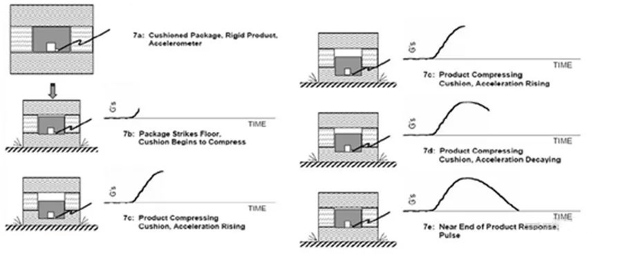 我們把產品受到沖擊一瞬間的整個過程分解開來,產品受到沖擊的過程大致如下圖,通過下面的圖片我們可以清晰的感受到產品受到撞擊或者跌落的一瞬間產品被壓縮,再把應力釋放的整個過程: